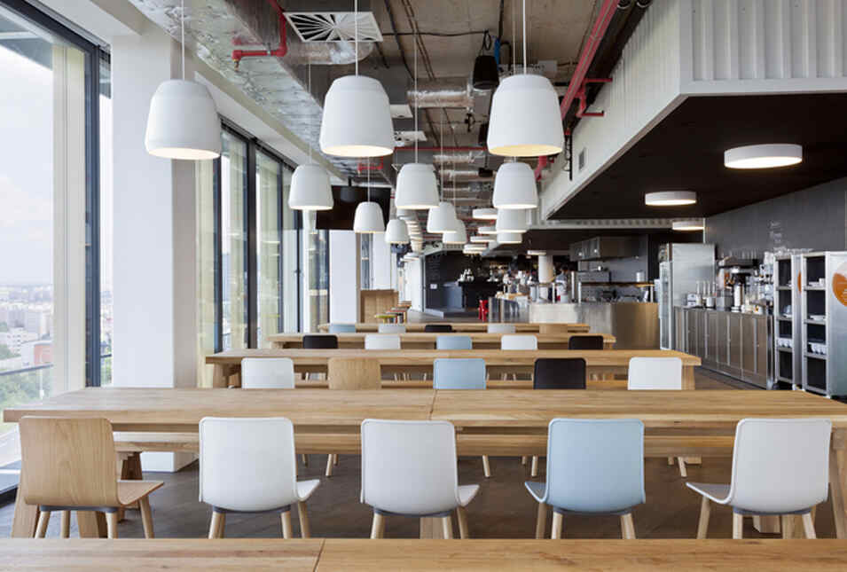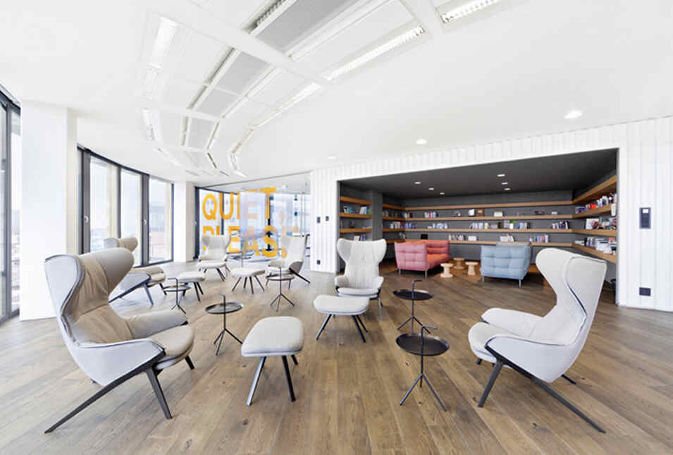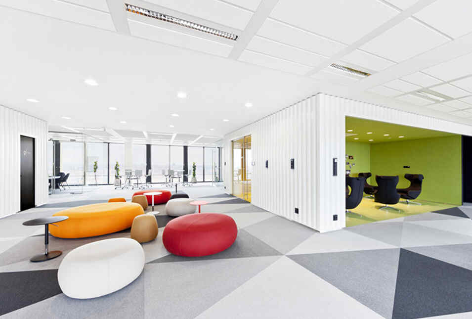 設(shè)計(jì)介紹:好玩的辦公室,體育館、娛樂室、游戲室、創(chuàng)造放松的空間,石頭型的多彩座椅,更顯趣味性,粉色的沙發(fā)是休息的法寶,并且設(shè)置的有圖書館,供人們休息室查閱,軟裝的座椅舒適,實(shí)用,還有用餐區(qū),木質(zhì)的座椅更加安全,健康,照片墻以綠色為背景顯得清晰明了,人性化,設(shè)計(jì)了體育館,員工們健身娛樂。
