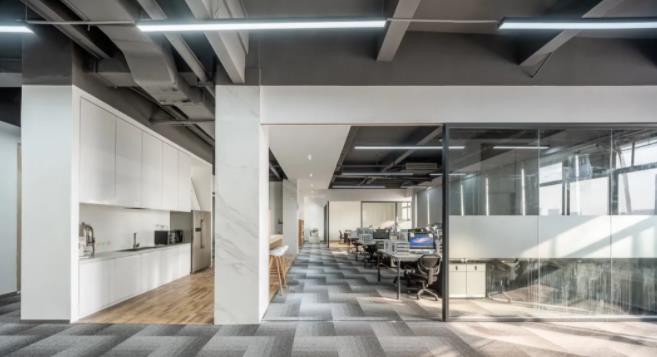 2、協(xié)作與可持續(xù)理念相結(jié)合的開放式辦公室設(shè)計(jì):天花設(shè)計(jì)富有特色,由白色穿孔金屬板彎折出具“通風(fēng)”功能的裝飾吊頂。光澤的金屬質(zhì)感與粗獷的黑色原始建筑頂面形成強(qiáng)烈的視覺反差。新舊的對(duì)比、色彩的對(duì)比、質(zhì)感的對(duì)比、簡練的設(shè)計(jì)結(jié)合當(dāng)下潮流靈動(dòng)辦公理念,成功塑造出一個(gè)具專業(yè)氣質(zhì)的時(shí)尚辦公空間。
